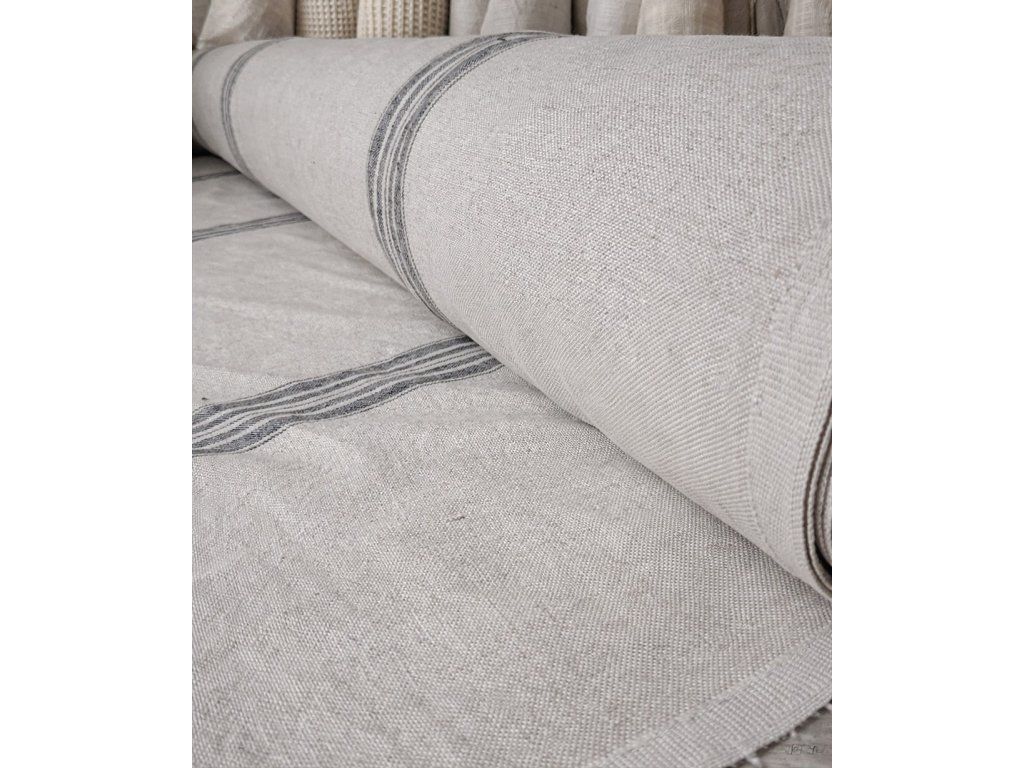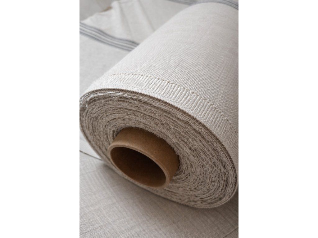 Krásný 100% přírodní len ve vysoké gramáži 320 g/m² s charakteristickými modrými vintage proužky v oblíbeném stylu grain sack. Látka má pevnou, kvalitní strukturu a přirozený režný odstín, který podtrhuje autentický vzhled lnu.