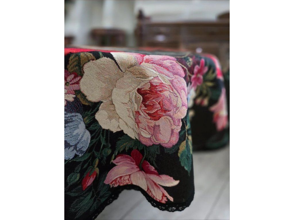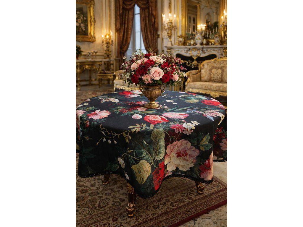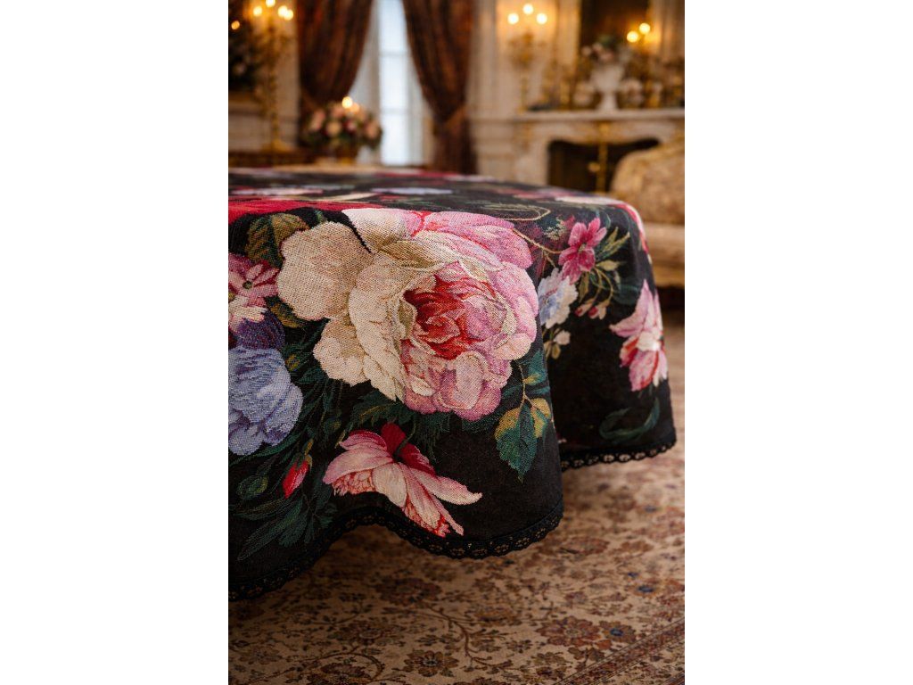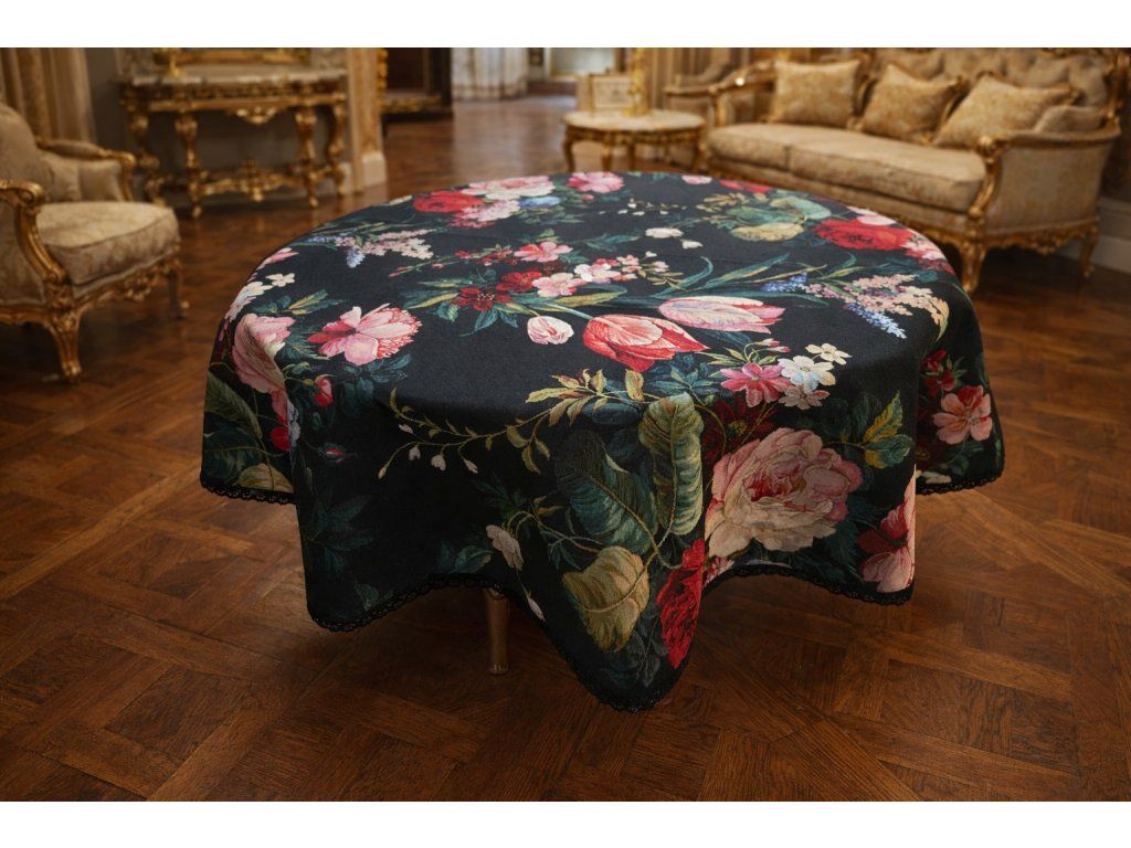 Gobelínový ubrus na kulatý stůl - průměr 140cm se vzorem zámeckých květin zakončený černou krajkou
