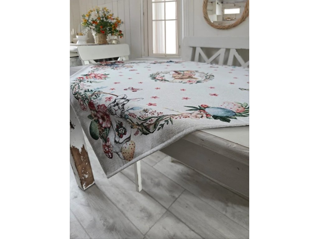 Velikonoční gobelínový ubrus o rozměrech 93x93cm je krásným doplňkem pro slavnostně prostřený stůl. Jemný motiv zajíčků s velikonočními vajíčky a květinami vnese do Vašeho domova svěží jarní atmosféru a útulnou sváteční náladu. Skvěle se hodí na jídelní stůl, komodu nebo konferenční stolek jako elegantní středový ubrus.