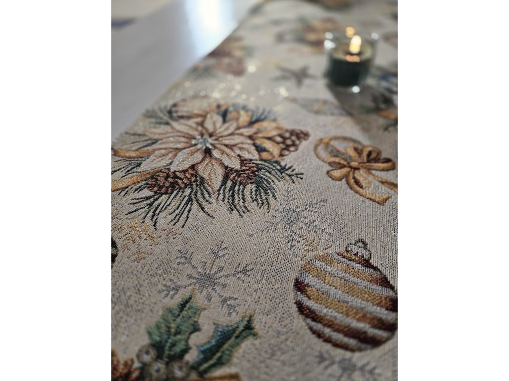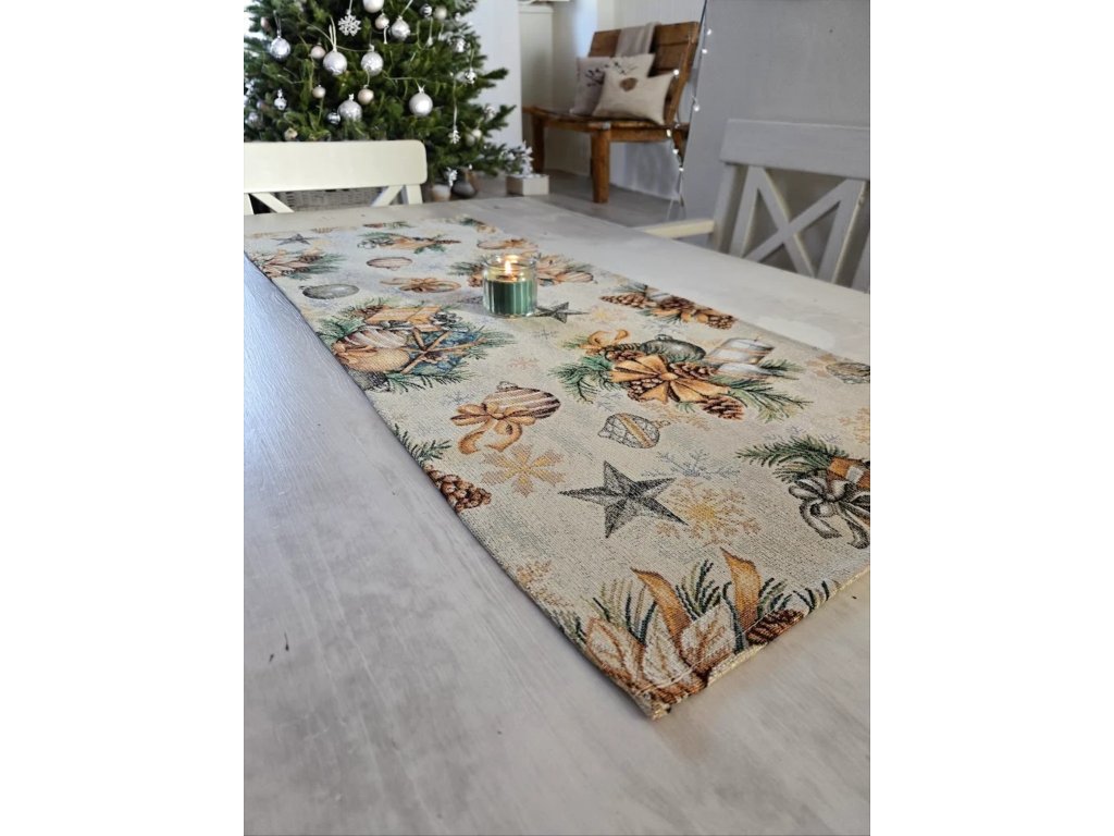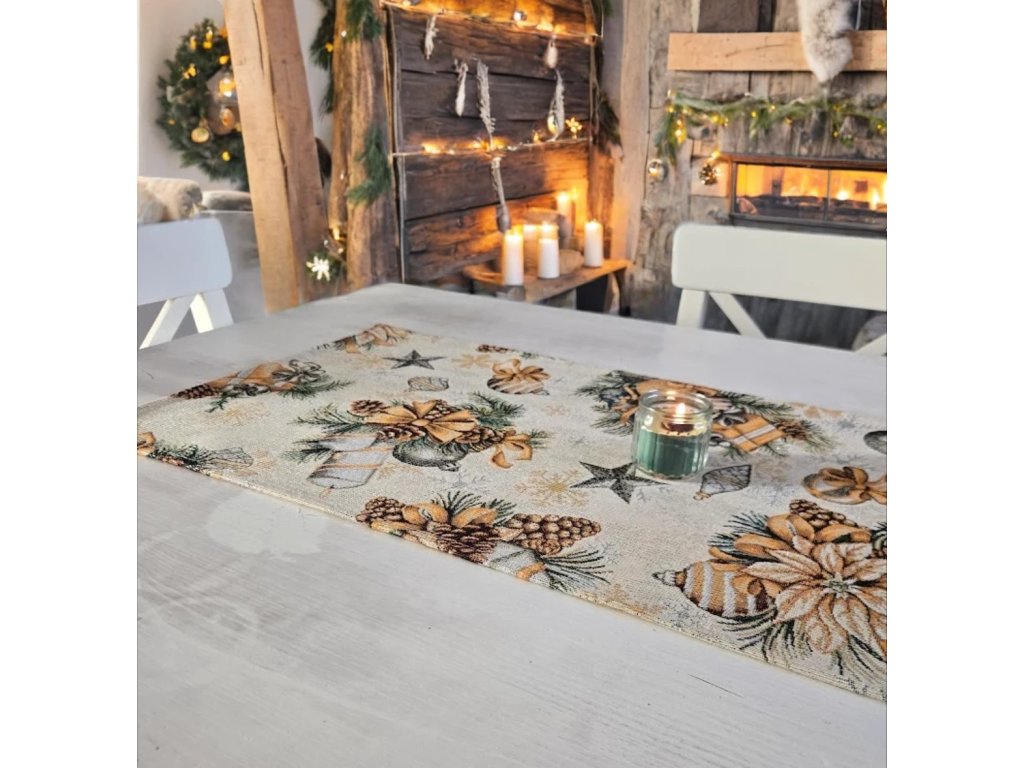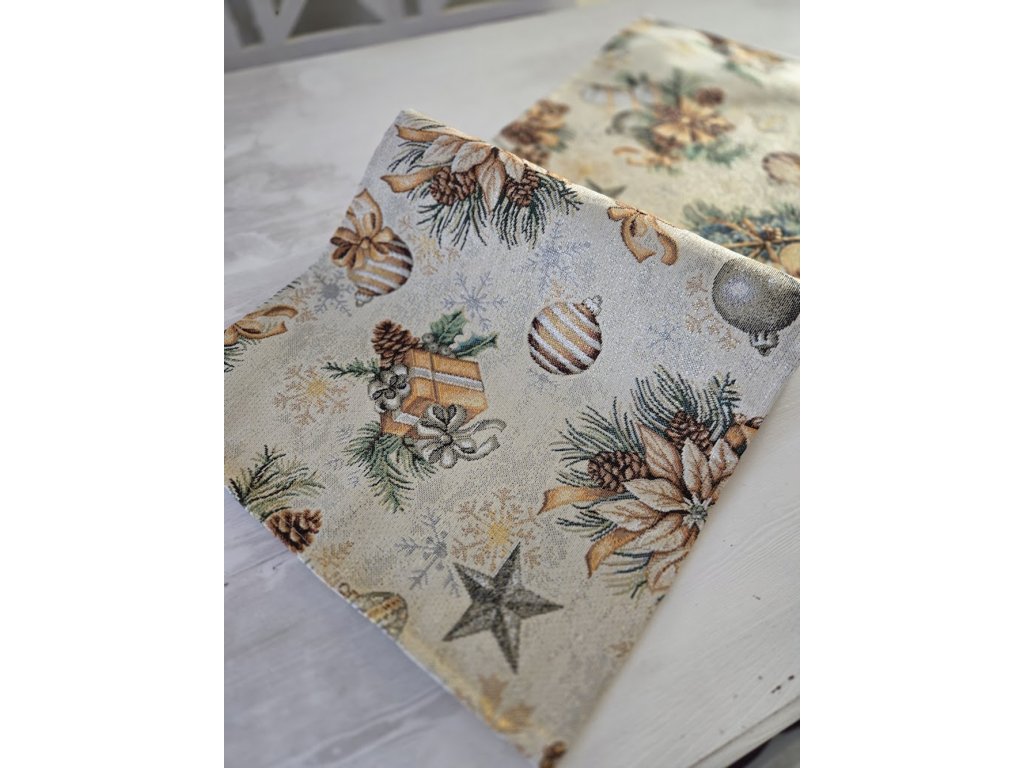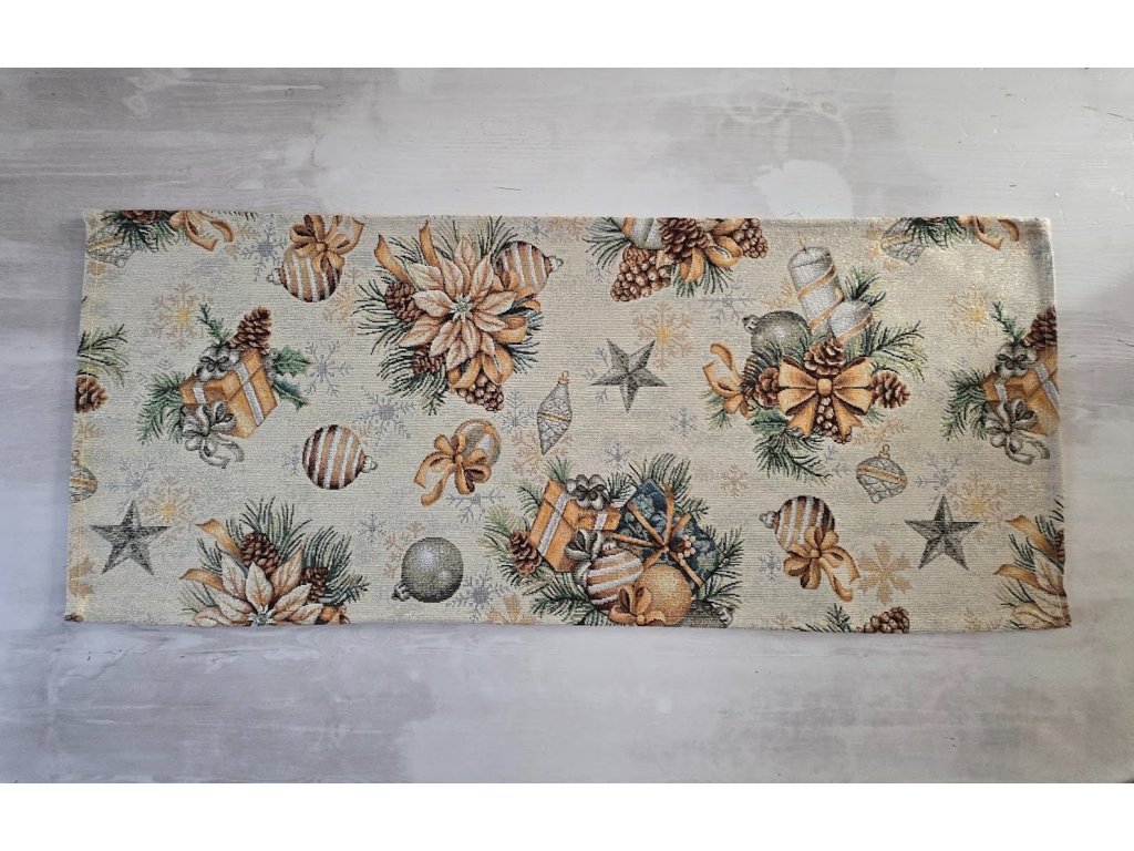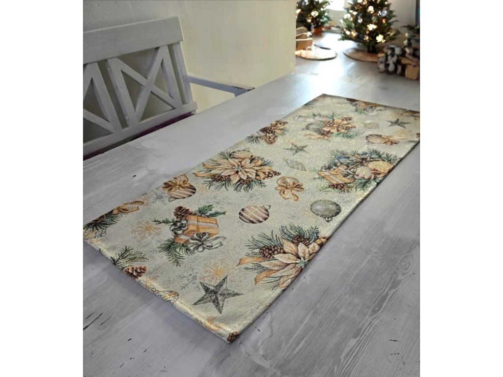 Vánoční, gobelínový běhoun protkávaný zlatou nitkou o rozměrech 35x90 cm. Tento středový ubrus Vám vykouzlí krásný, slavnostní interiér.