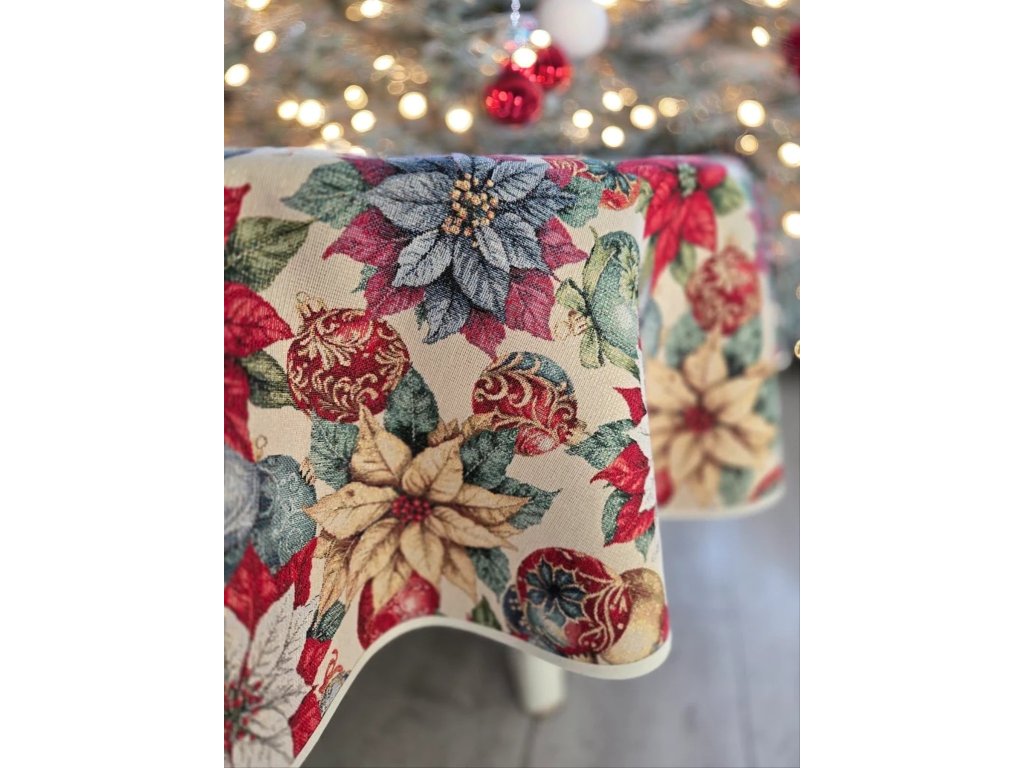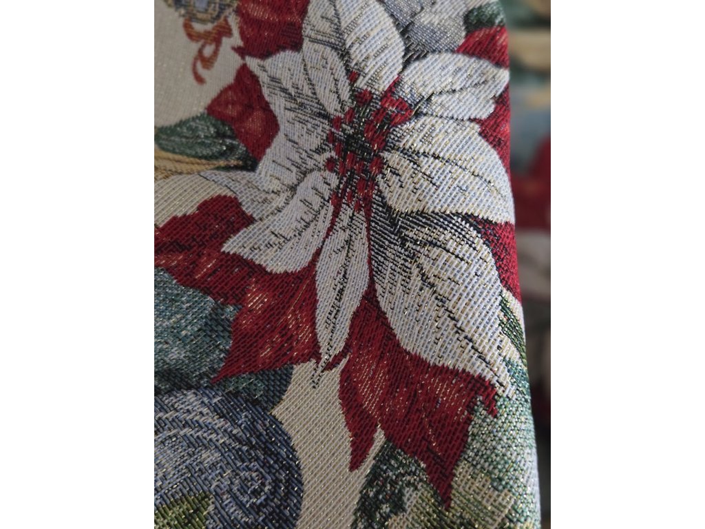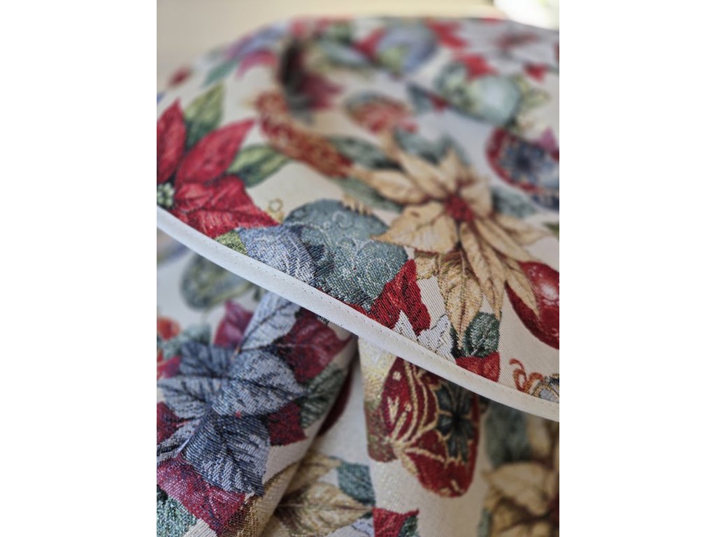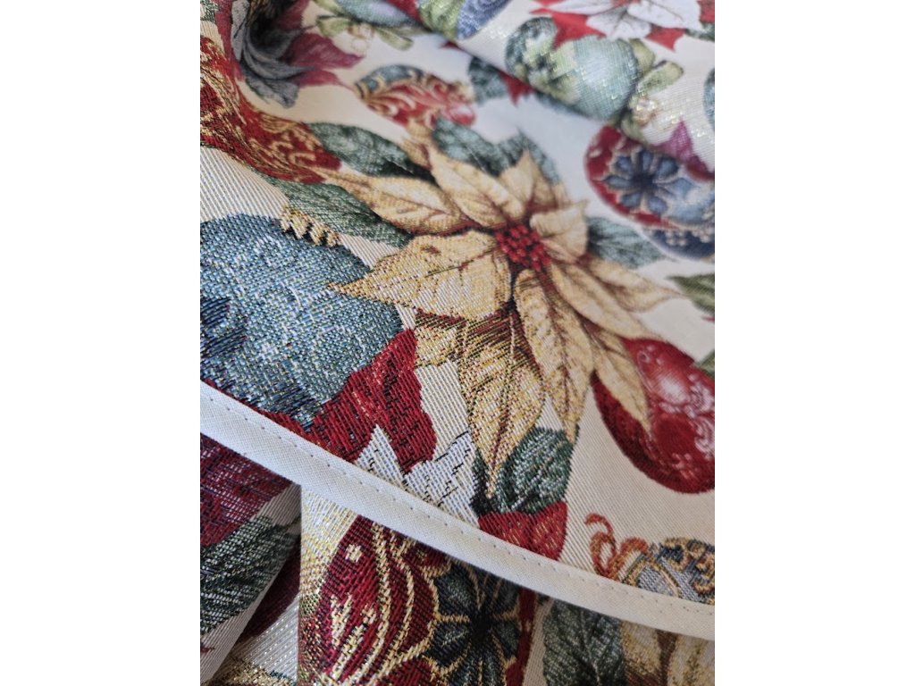 Vánoční, gobelínový ubrus na kulatý stůl má průměr 140cm a je zakončený šikmou lemovkou ve smetanové barvě. Tento velmi kvalitní ubrus vykouzlí krásný a slavnostní interiér.