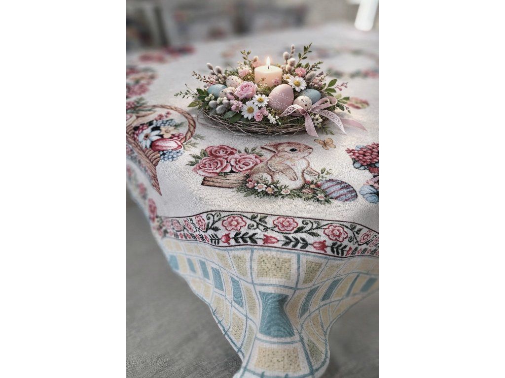 Velikonoční, gobelínový ubrus má rozměry 145x145 cm. Tento velmi kvalitní ubrus vykouzlí krásný a slavnostní interiér.