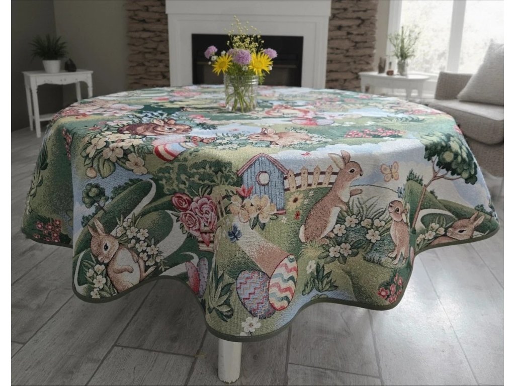 Gobelínový ubrus na kulatý stůl se vzorem velikonočních králíčků, vajíček a kuřátek