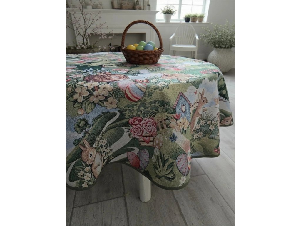 Velikonoční, gobelínový ubrus na kulatý stůl nabízíme v průměrech 140cm a 160cm. Je zakončený šikmou lemovkou v béžové barvě ladící k celkovému vzhledu ubrusu. Tento velmi kvalitní ubrus vykouzlí krásný a slavnostní interiér.