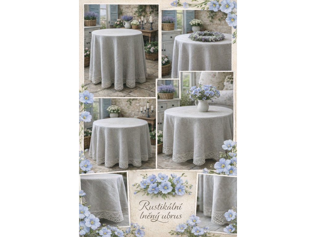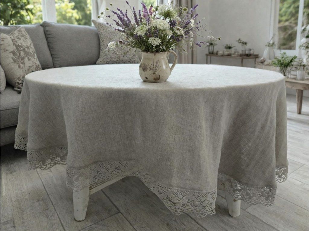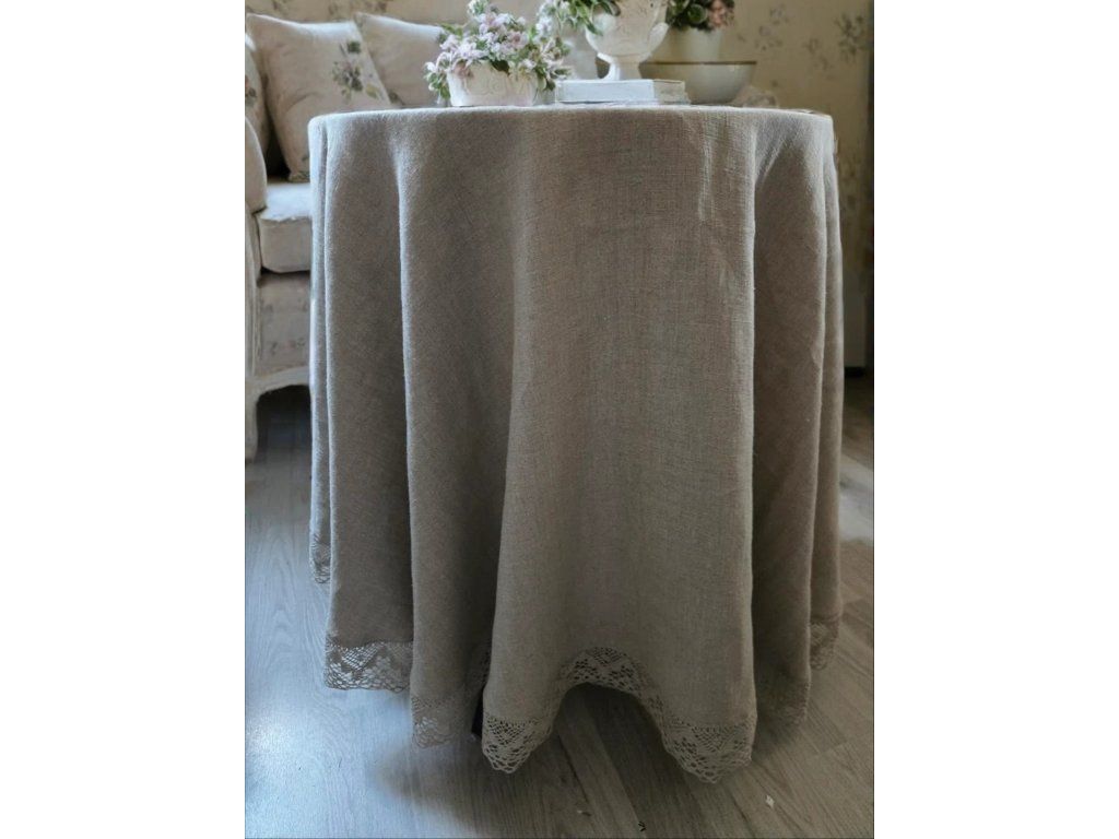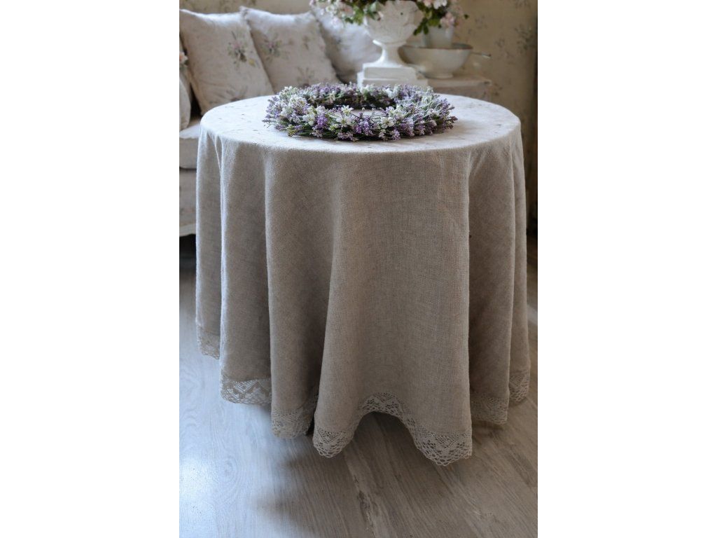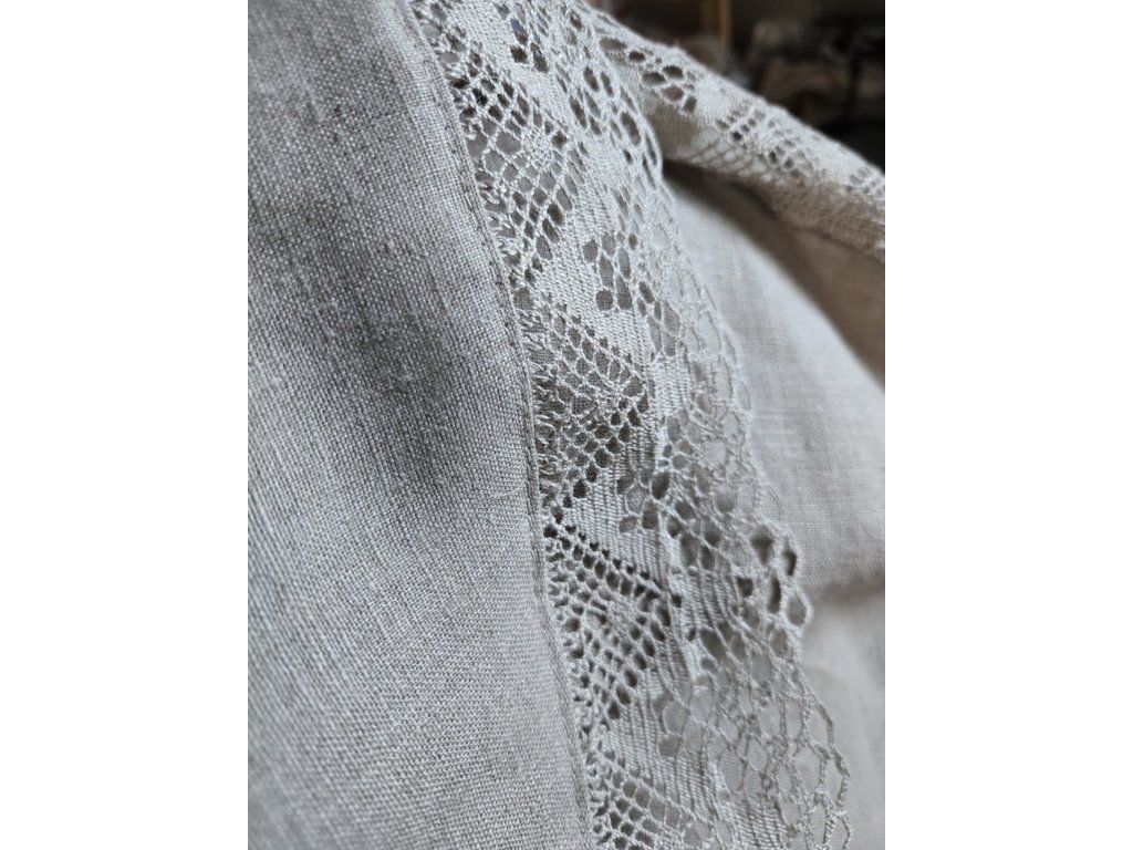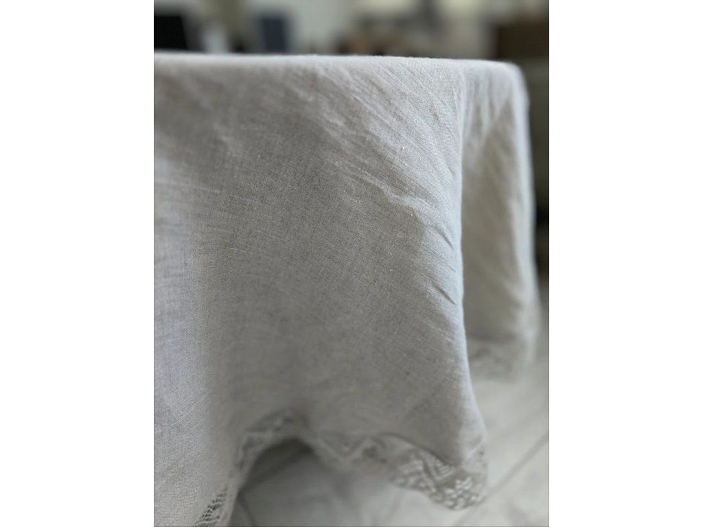 Přírodní odstín lnu podtrhuje jeho autentický charakter a snadno se kombinuje s rustikálním, venkovským i moderním interiérem. Okraj ubrusu je ozdoben lněnou krajkou v přírodní barvě o šíři 70 mm, která dodává jemný romantický detail a podtrhuje tradiční řemeslné zpracování.