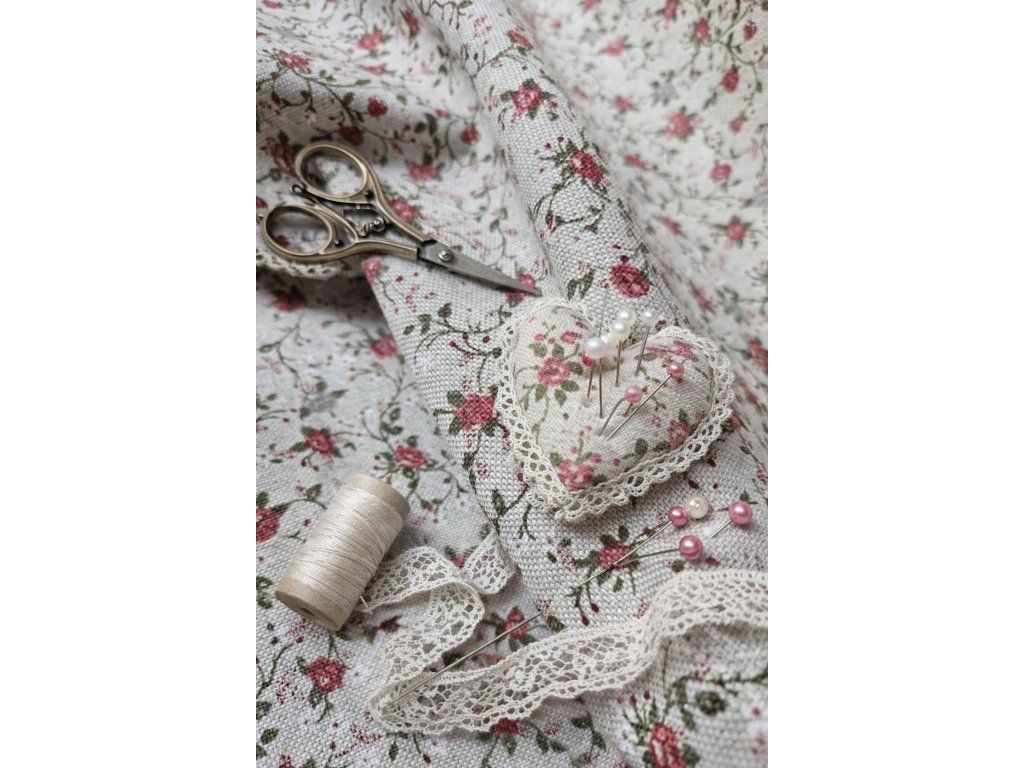 Směsová, dekorační látka - metráž dovoz Francie drobné růžičky na režné