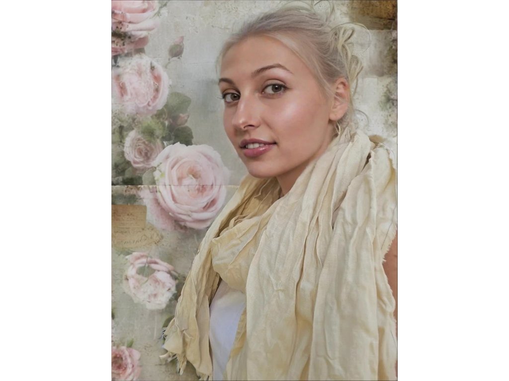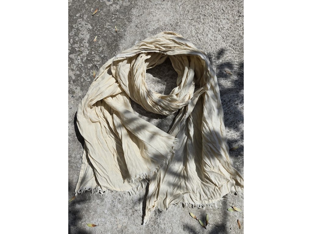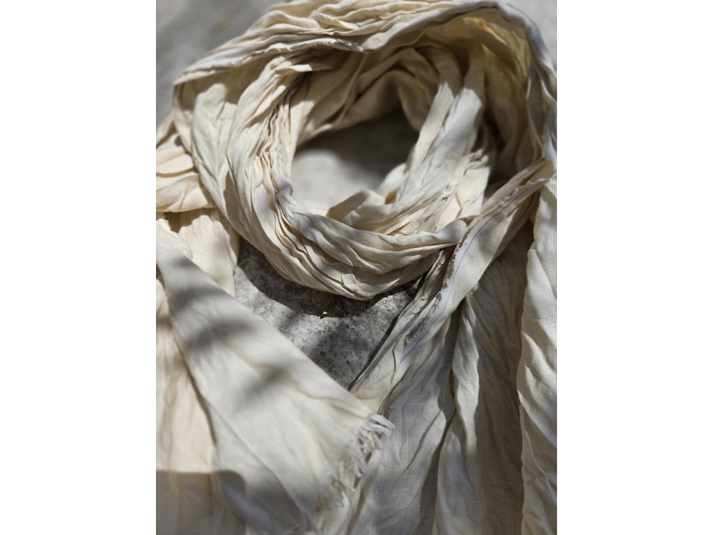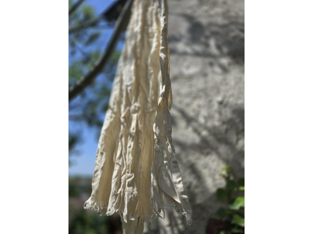 Velký a široký šál je ušitý ze 100% kvalitního lnu od španělského dodavatele. Dolní cípy jsou ozdobeny třásněmi o délce cca 2 cm, které dodávají jemný a elegantní vzhled.