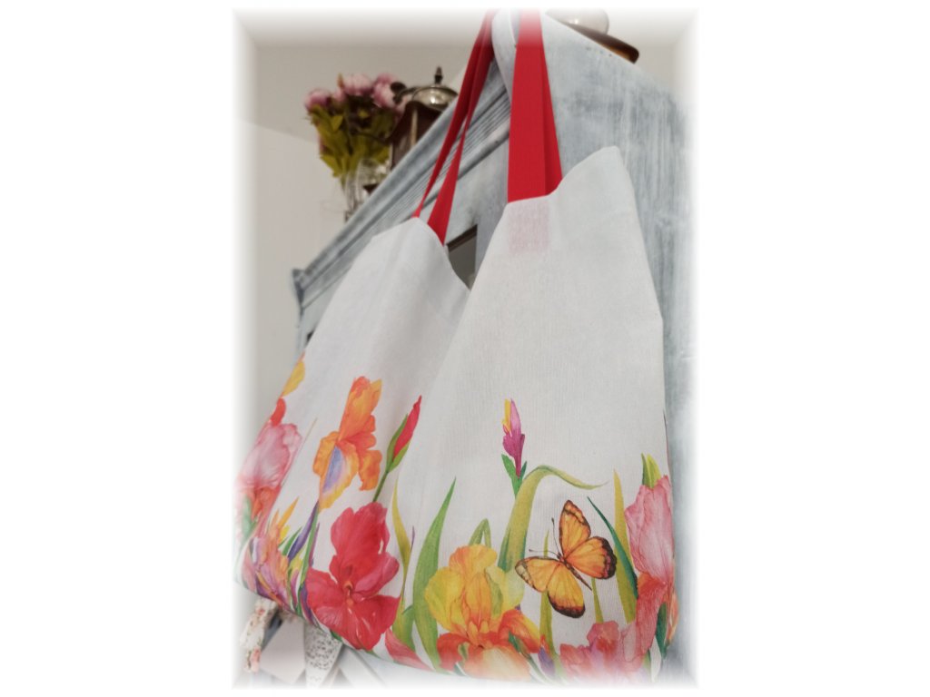 Prostorná a pevná nákupní taška, ušita z pevné metráže vyšší gramáže s motivem kosatců a motýlů. Kresba je v dolní části tašky z přední i zadní strany.