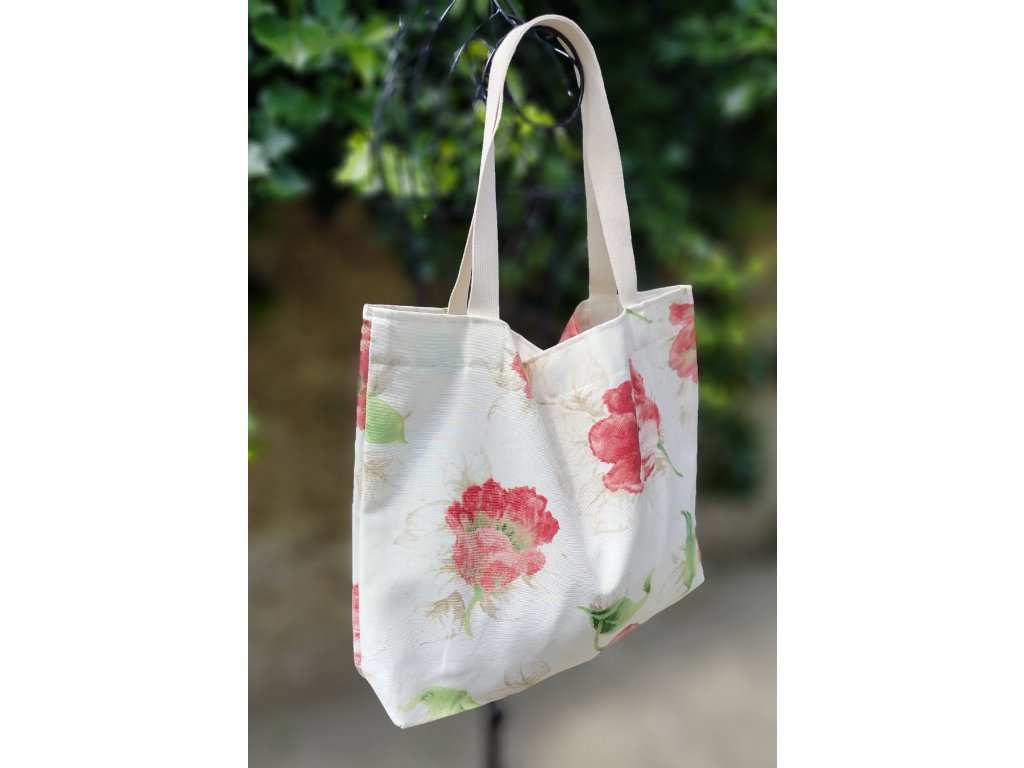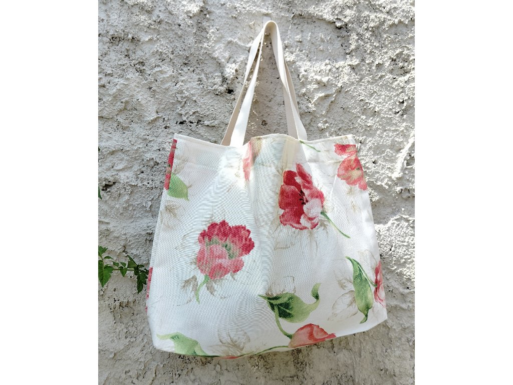 Prostorná a pevná nákupní taška, ušita z pevné metráže vyšší gramáže s motivem tulipánů v červeno, oranžových tónech na béžovém podkladu.
