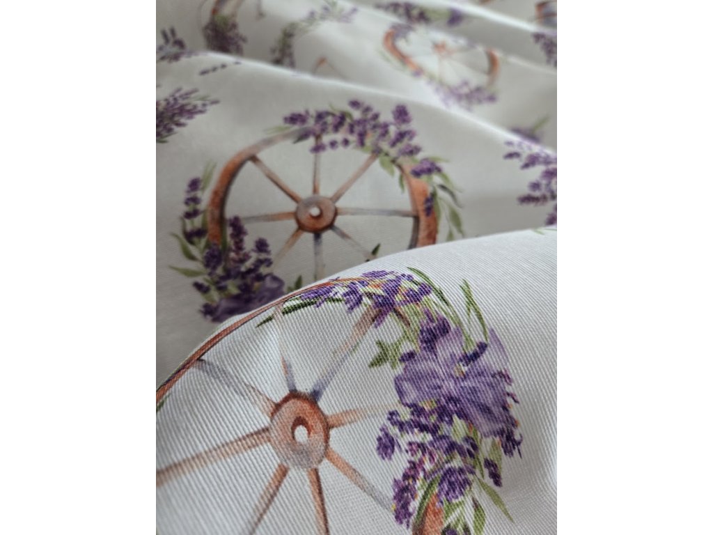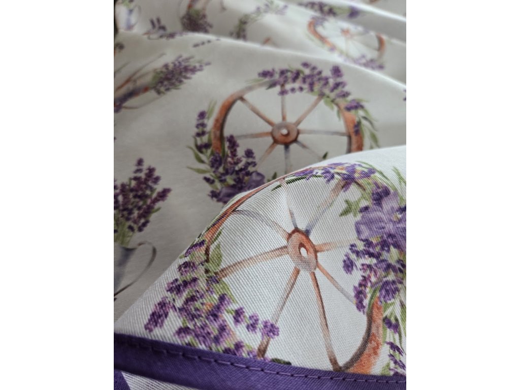 Vneste do svého domova nádech romantiky a venkovské pohody s tímto ručně šitým ubrusem s motivem levandule. Vzor levandulových květů, dřevěných kol a konviček na bílém podkladu působí jemně a elegantně, ideální pro každodenní stolování i slavnostní chvíle.