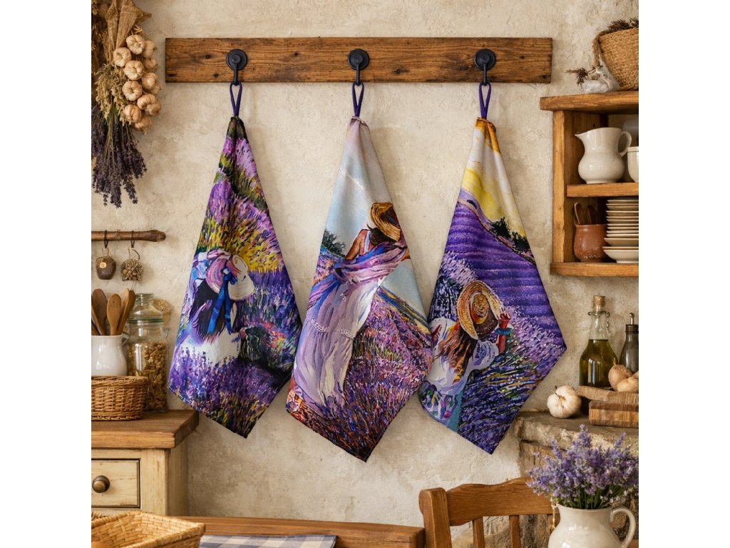 Utěrka s francouzským motivem romantické levandule. 100% bavlna vyšší gramáže - dobře saje a pěkně drží tvar. Rozměr 48x68cm + poutko na zavěšení. Velmi kvalitní digitální tisk. Látka dovoz Francie. V nabídce 3 motivy. Pokyny výrobce látky - doporučené praní 30°C + žehlit možno na 2-3 stupeň. Možno zakoupit utěrky samostatně či jako sadu (dle výběru motiv A,B,C nebo komplet tří utěrek).