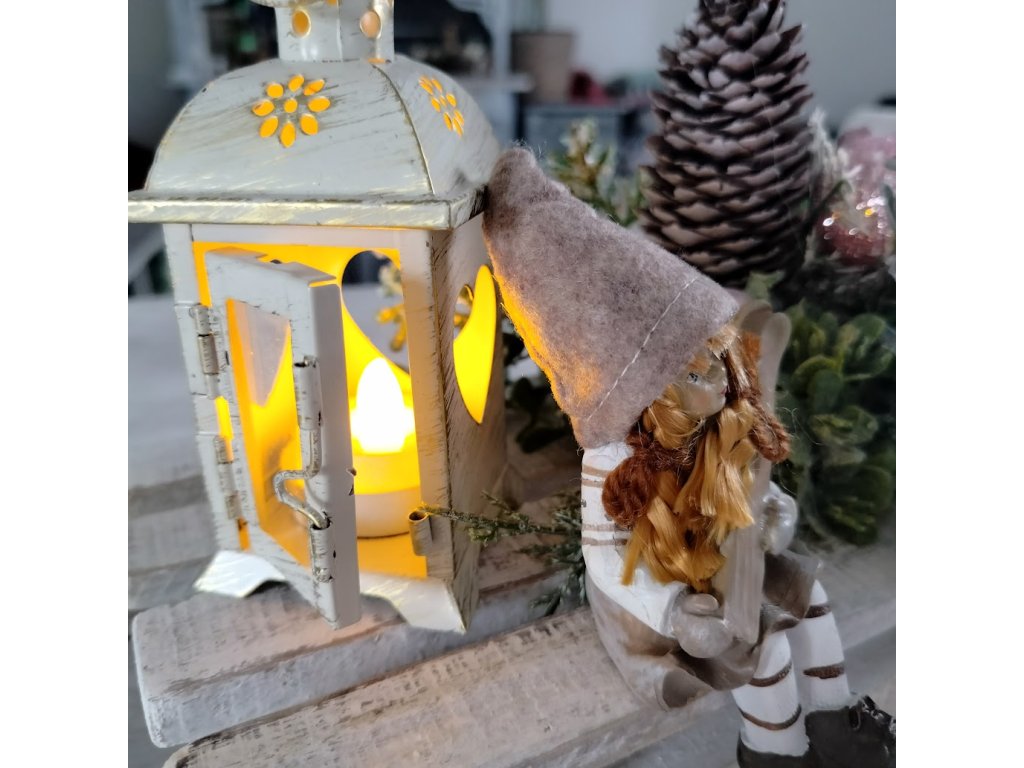 Sáňky zdobené vánoční výzdobou, lucerničkou s el. svíčkou a postavičkou holčičky s lyžemi. Vše v jemných vintage tónech