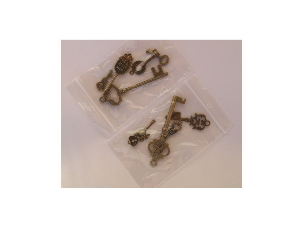 Sada 5ti kovových, velice detailních, starobylých klíčů. Tuto bižuterní komponentu využijete ne jen při výrobě šperků a ozdob, ale i pro scrapbookingové projekty, při výrobě taštiček, přáníček, deníčků, atd. Cena je za 5 kusů klíčů (provedení 3D) různých velikostí. 8 cm - 2,5 cm Materiál: kov / vzhled starobronz
